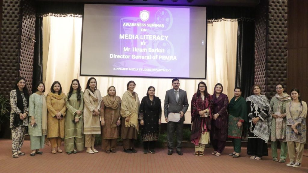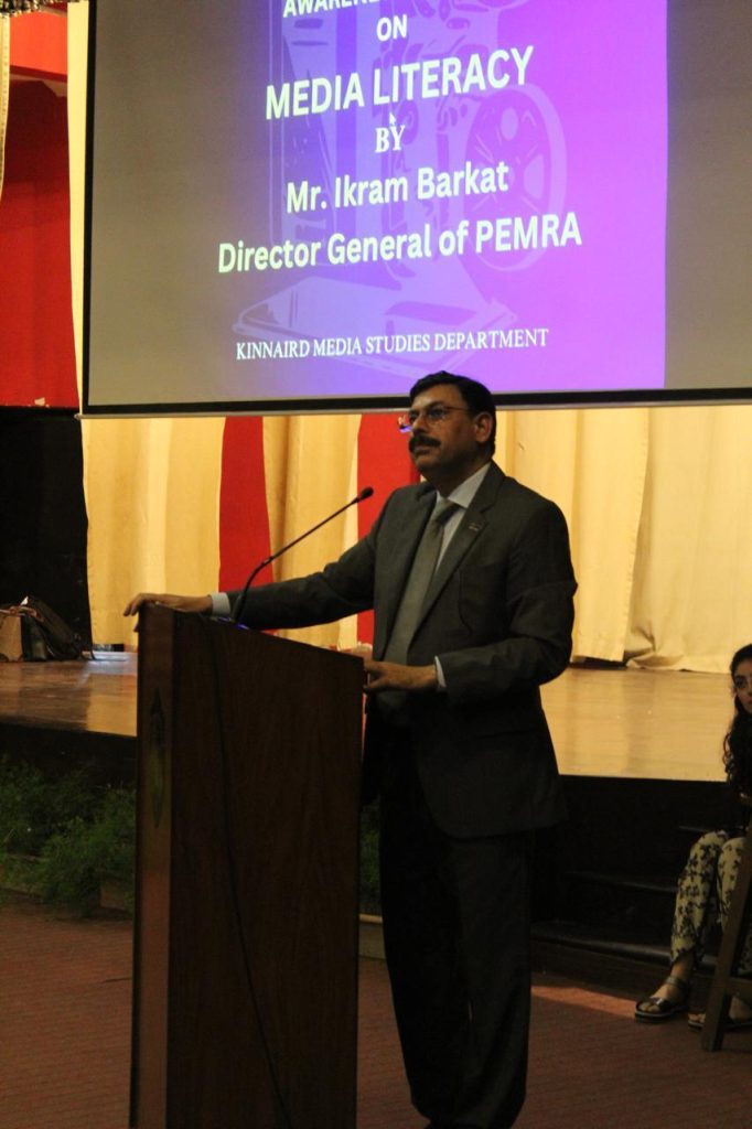 The Media Studies Department of Kinnaird College for Women successfully organized an awareness seminar on Media Literacy, featuring Mr. Ikram Barkat, Director General of Pakistan Electronic Media Regulatory Authority (PEMRA) as the keynote speaker. Mr. Ikram Barkat has been bringing over 27 years of experience in public service to his role and has demonstrated a commitment to enhancing media standards and media literacy among people. The event took place on 12th March at Hladia Hall and was attended by Principal Prof. Dr Iram Anjum, Dean of Social Sciences and Humanities Dr Masha Asad Khan, Dean of Post Graduate Programs Dr Asma Awan, Dean of Life Sciences Dr Hooria, Dean of Natural Sciences Dr Rahila Huma, Dean of Intermediate Dr Hellen Khokhar faculty members, students and media enthusiasts.