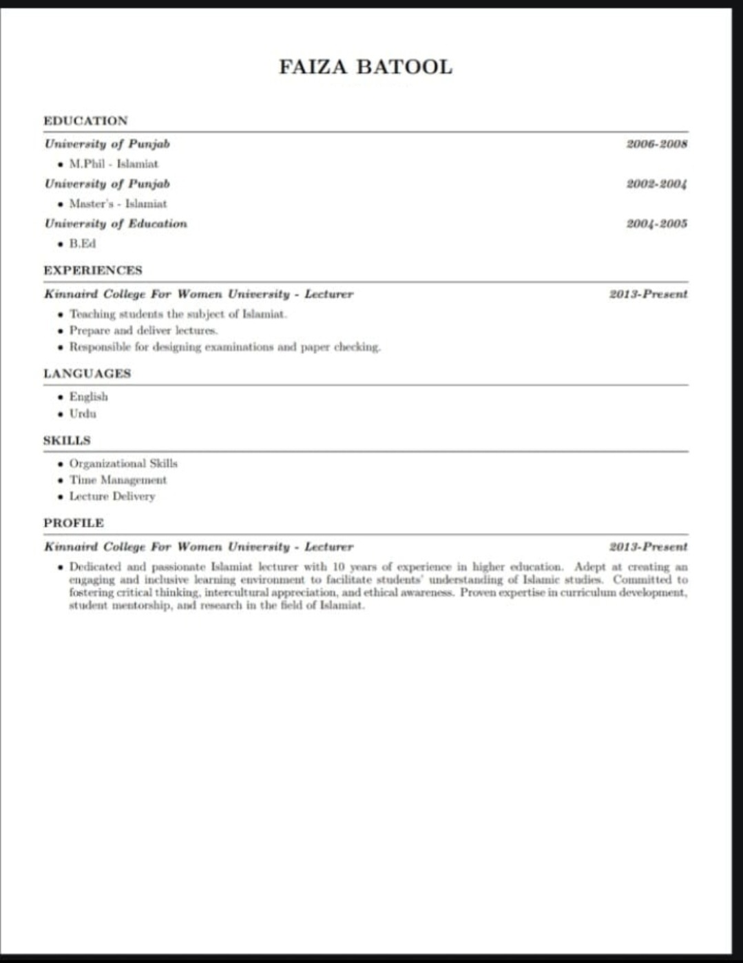 Department of Islamic Studies Ms. Tasneem Niazi Assistant Professor MPhil Islamic Studies (Minhaj University, Lahore) MA Islamic Studies (Islamia University of Bahawalpur, Bahawalpur) Download CV Ms. Sara Iqbal Assistant Professor MPhil Islamic Studies (University of the Punjab, Lahore) MA Islamic Studies (University of the Punjab, Lahore) Download CV Ms. Samawia Saeed Lecturer MA Islamic Studies (Lahore College for Women University) MA ELT (Kinnaird College for Women, Lahore) Download CV Ms. Faiza Batool Lecturer MPhil Islamic Studies (University of the Punjab, Lahore) MA Islamic Studies (University of the Punjab, Lahore) Download CV Ms. Abida Ishaq Lecturer MPhil Islamic Studies (Minhaj University, Lahore) MA Islamic Studies (University of the Punjab, Lahore) Download CV